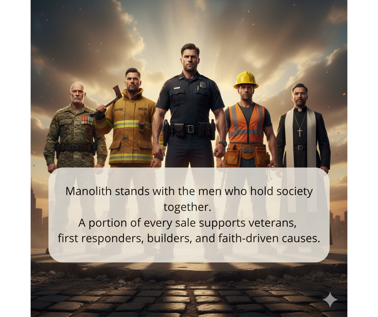 At Manolith, we honor those who carry the weight of the world on their shoulders — the men who run toward danger, who build with their hands, who protect, serve, and sacrifice without asking for anything in return. That’s why a percentage of every sale is donated to causes that support the real heroes of our society :